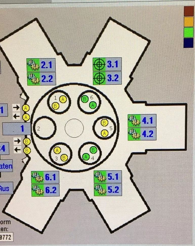 如下图所示,从2.1到6.2共有10个切削主轴,所有切削主轴将在不同的工件上同时加工。每个工作台上装四个工件,而同时能被加工的工件只有两个。工作台都可以±180°旋转。